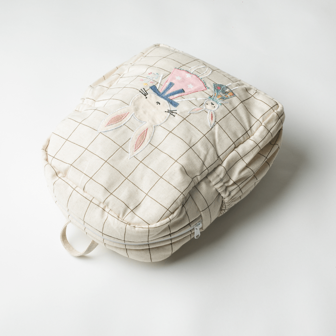 Zoey’s pure cotton, handcrafted, plastic free School Backpack! Adorable and super functional backpack has plenty of storage space for toddlers to carry books, snacks, water bottle and more. Made of pure cotton fabric with cotton straps, the bag is handcrafted in Kasganj (UP) by experienced artisans. The gorgeous Bella Bunny Girl with her Doll patchwork is also made of cotton fabric is neatly embroidered on the bag. It has one main compartment with two side pockets, inner zipped pocket and 2 small organizer. The straps are soft with padding and adjustable buckle. Being made of pure cotton the bag can simply be machine washed any number of times. The bag comes in two sizes, the big one is more functional for school purpose while the small one is super adorable to carry on casual outings.