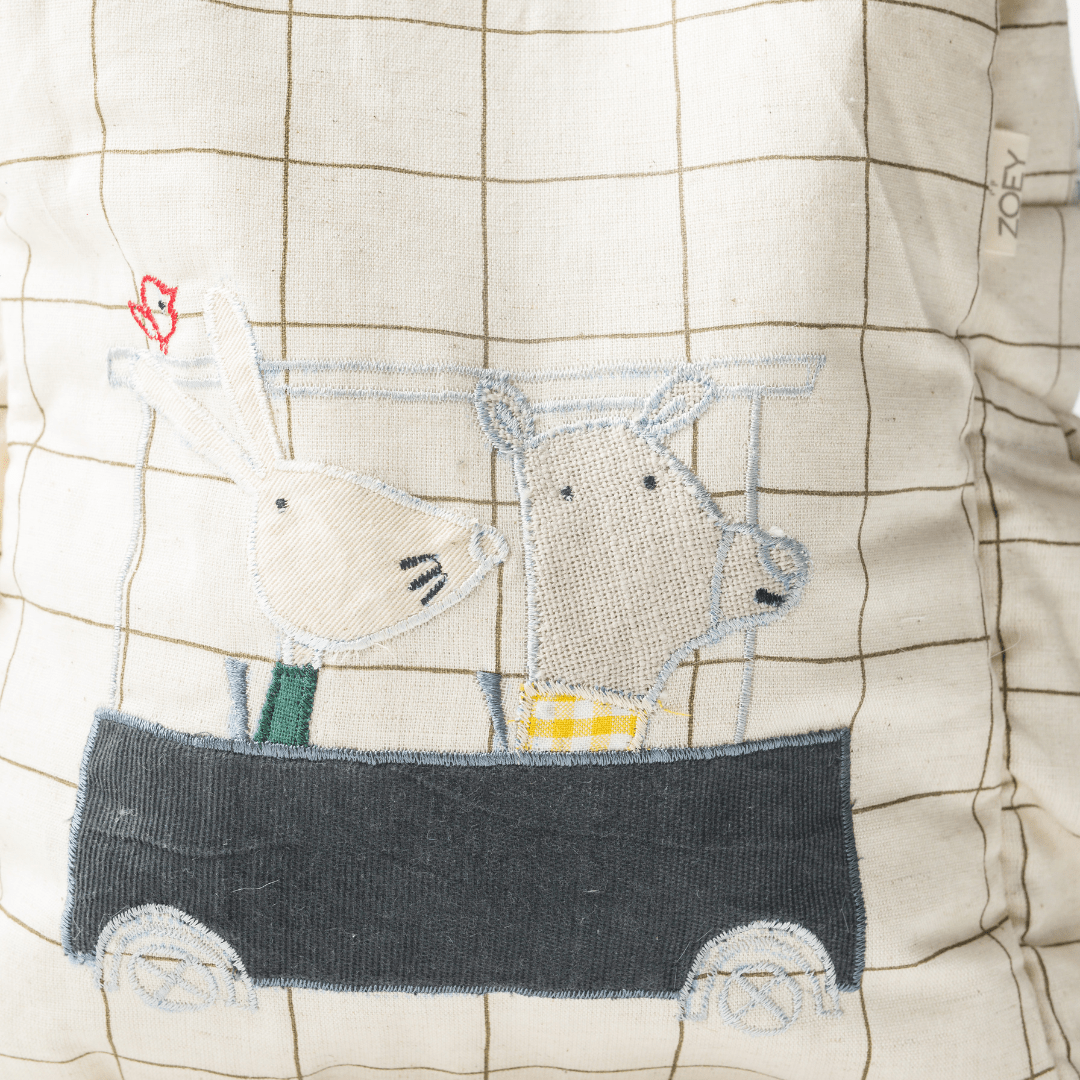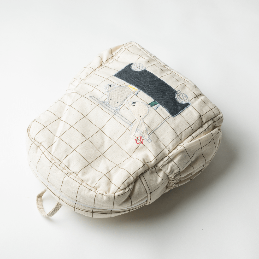 Zoey’s pure cotton, handcrafted, plastic free School Backpack! Adorable and super functional backpack has plenty of storage space for toddlers to carry books, snacks, water bottle and more. Made of pure cotton fabric with cotton straps, the bag is handcrafted in Kasganj (UP) by experienced artisans. The adorable Buggy Ride with Animals patchwork is also made of cotton fabric & is neatly embroidered on the bag. It has one main compartment with two side pockets, inner zipped pocket and 2 small organizer. The straps are soft with padding and adjustable buckle. Being made of pure cotton the bag can simply be machine washed any number of times. The bag comes in two sizes, the big one is more functional for school purpose while the small one is super adorable to carry on casual outings.